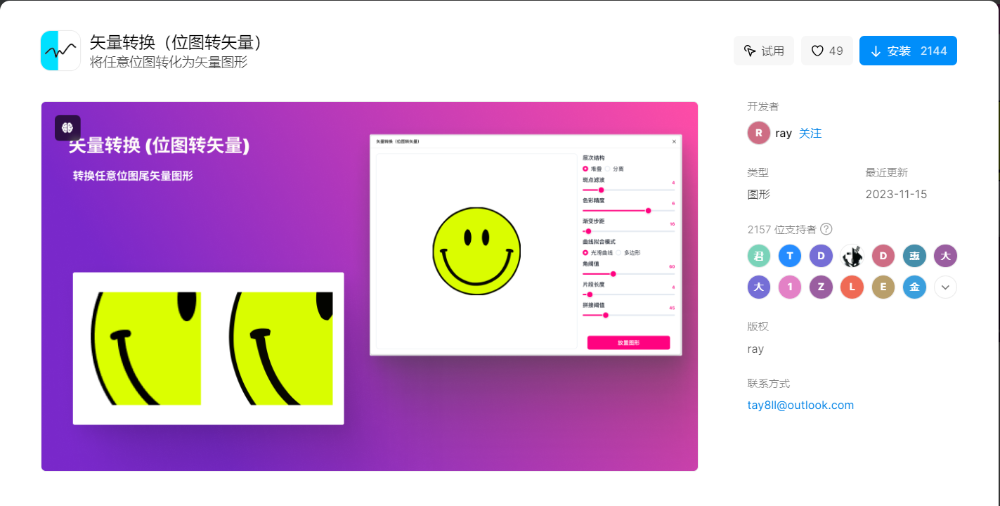 使用即时设计将位图转为矢量图非常简单,只需用到一个矢量转换的小插件。安装后在工作台选择画布上的一个图片,运行插件,可以直接对图像的层次结构、色彩精度、曲线拟合模式等进行修改操作,插件转换完毕后,点击放置图形就可以完成了,是不是非常简单呢?