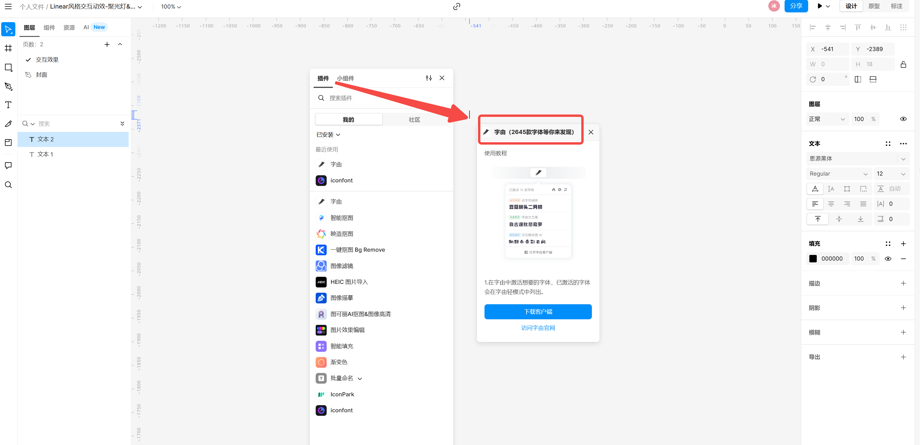 字由集合了两千多款在线免费商用的字体,字加集合了上万款字体,这两个插件足够帮助我们探索字体设计的更多可能!只需一键安装插件,然后在即时设计中激活某款字体,接着在即时设计软件中刷新页面,最后就可以调用里面的字体了。它们里面的字体资源都可以免费使用,无需担心版权纠纷问题,是一个比较优质的字体资源库。