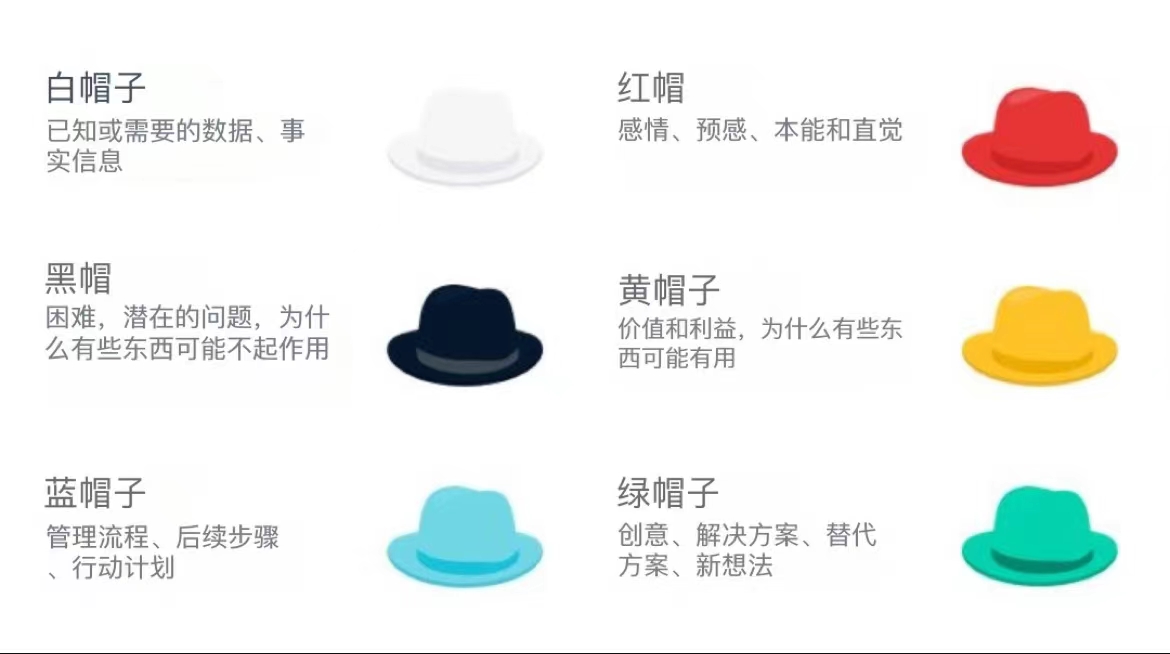 六顶思考帽其实是一种比喻手法,它们分别代表着现实、情感、信息、逻辑、希望和创意,用帽子这种具体的形式来表达上述抽象概念,可以更快地思考出问题的解决方法。我们在使用之前,要分清楚每顶帽子所代表的含义有哪些。好啦,以上就是为大家详细介绍的六顶思考帽原则,最后,非常推荐你用即时白板使用六顶思考帽,都是可以免费使用的噢~