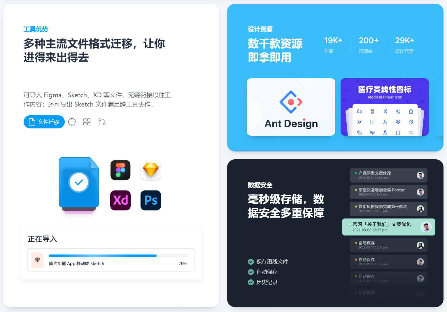 除了上述优势,“Sketch免费破解版”即时设计还能无缝导入 Sketch 文件,特别提供 Sketch 适配模式,让设计师能够沿用 Sketch 的操作习惯,包括快捷键和滚轮操作,极大地缩短了新手设计师们的学习时间。即时设计不仅兼容多种不同格式的文件转化,支持导入 Figma、XD、Sketch 等文件,支持导出本地文件、PDF 和 Sketch 格式文件,还能进行二次编辑,更加便捷高效。