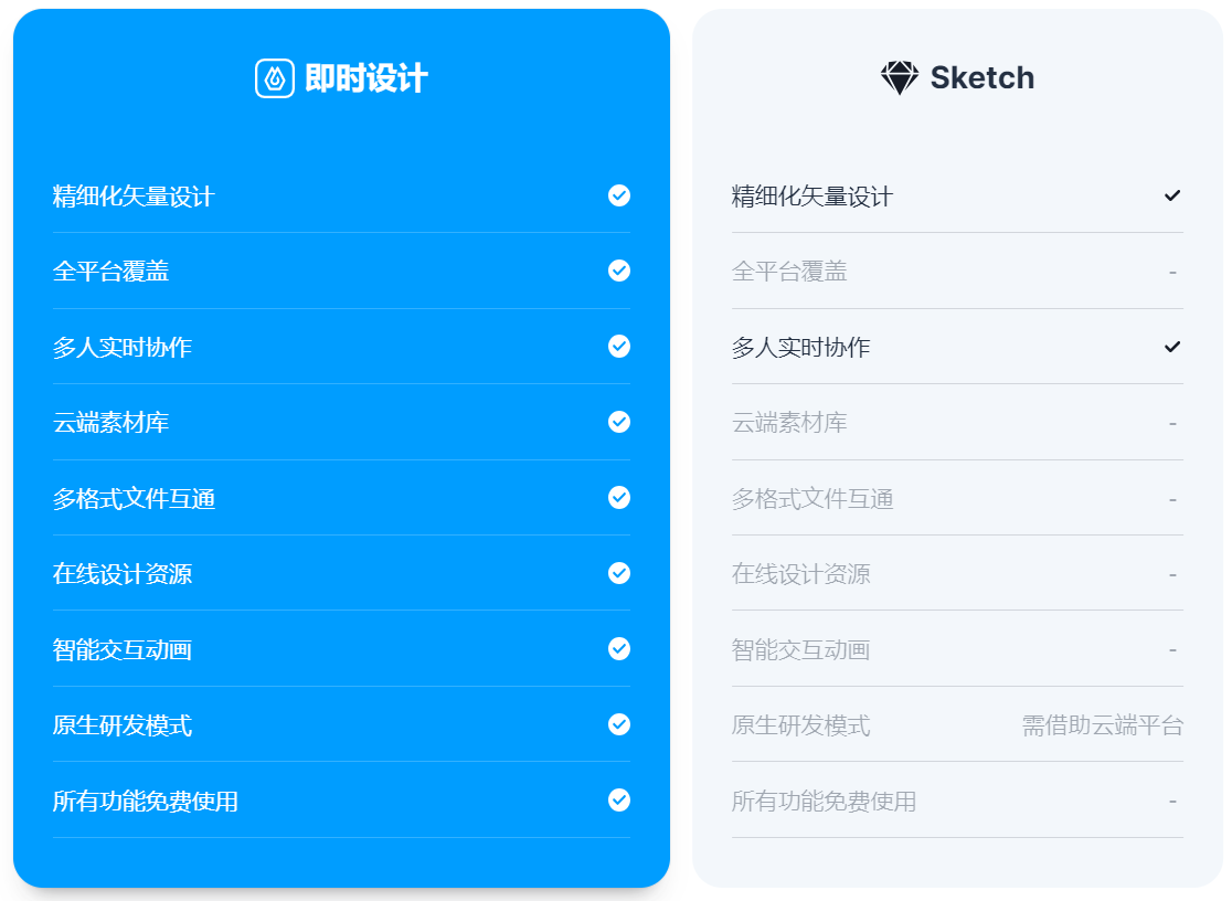 即时设计作为一款精细化矢量云端在线 UI 设计工具,拥有强大的设计功能,被称为“Sketch免费破解版”基本覆盖 Sketch 的全部功能。在此基础上,即时设计进行了本土化和更多的功能创新,它的钢笔工具、矢量运算、矢量图形编辑等功能与国外工具相比,是专为原生中文设计师们打造的专业级设计工具,更符合国内设计师、产研团队的需求。