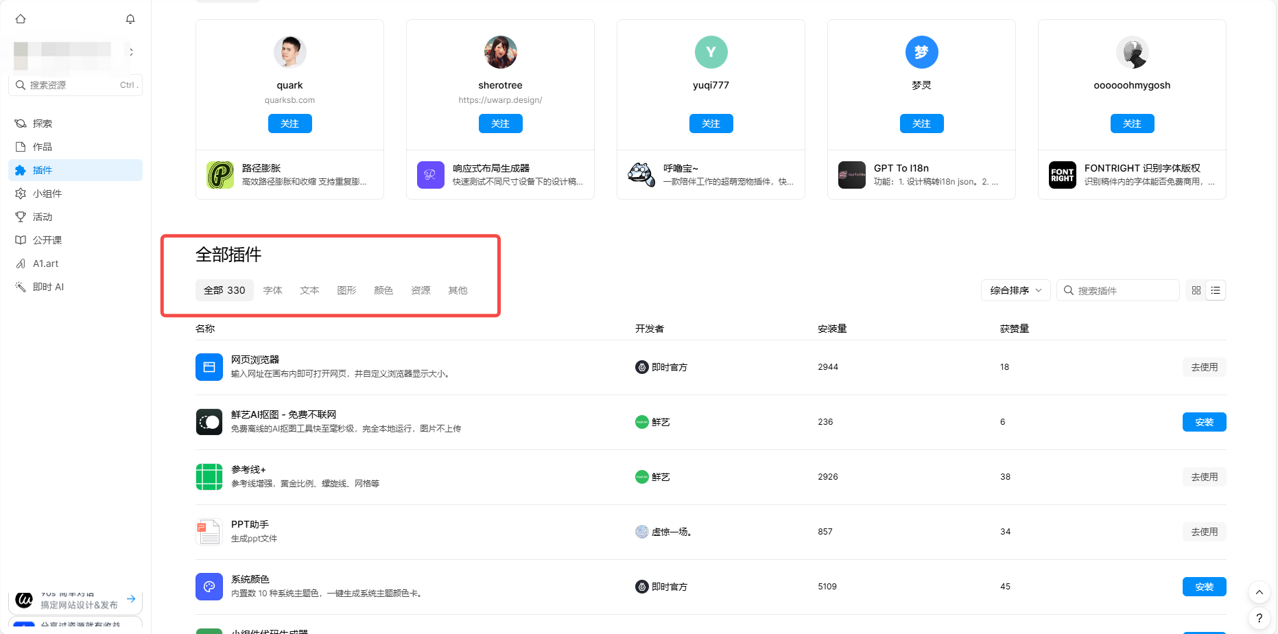 除了一键即可使用 Sketch免费模板素材之外,即时设计还有插件广场,上线了可以让你的设计作品脱颖而出的插件,比如网页浏览器、PPT 助手、系统颜色、小组件代码生成器、AI 擦图等众多宝藏插件,一键就可以安装免费试用!