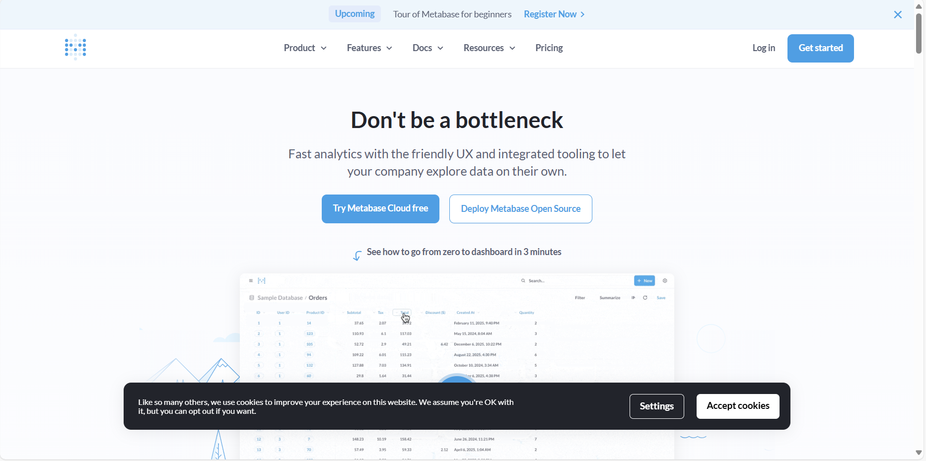 Metabase 也是一个数据可视化软件,可以直接连到 20+ 数据源中的任何一个,所有人都有权限访问元数据库,可以不使用 SQL 就可以在 UI 软件中查询每一个进度的数据可视化。