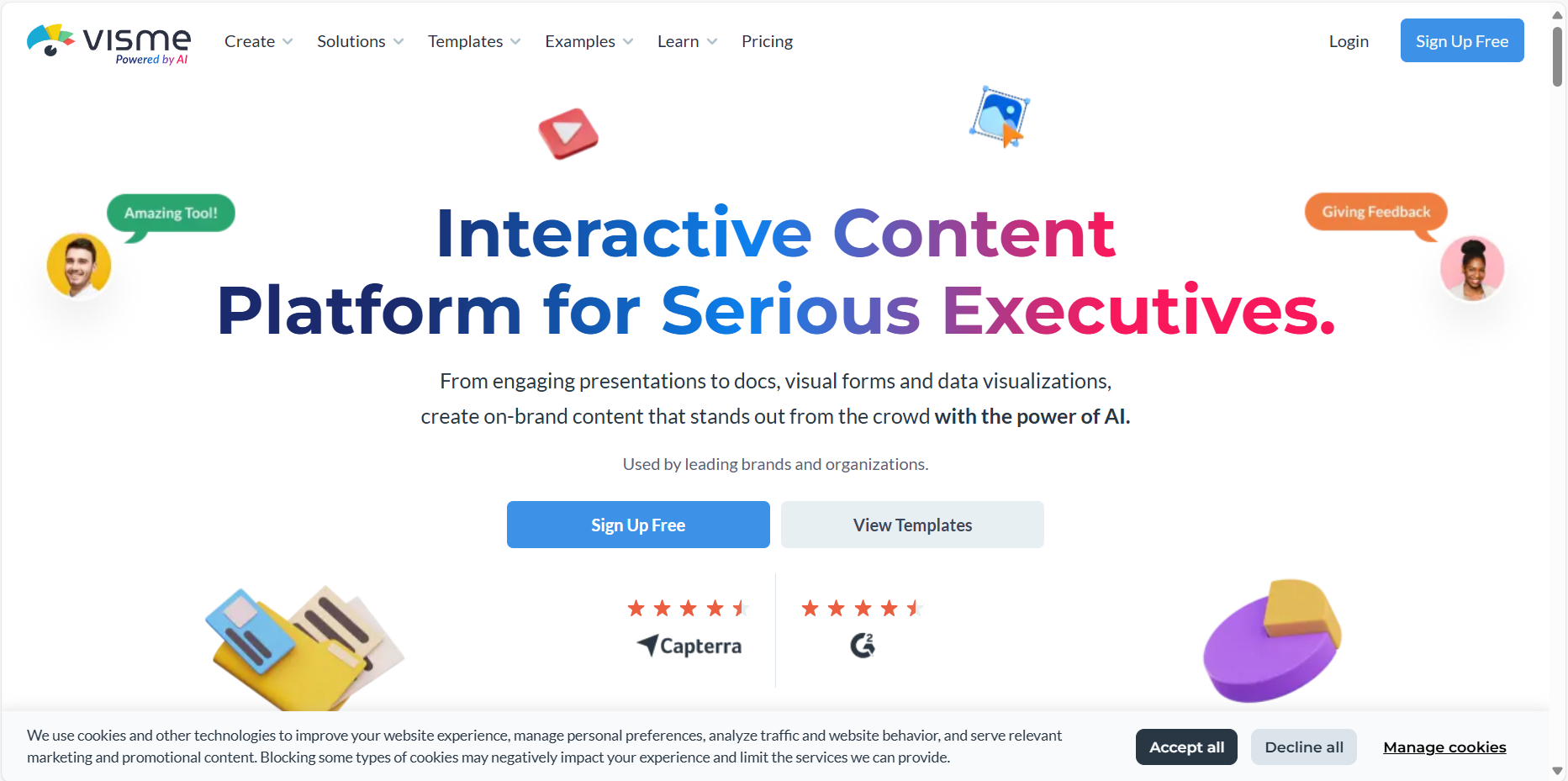 Visme 是一个在线可以从演示文稿到文档、视觉表单和数据可视化的平台,除了可以制作数据可视化,该平台还可以设计专业报告、提案和白皮书、社交媒体内容、视频、线框和模型等。是一个功能齐全的平台,也是世界各地的企业都在使用的 Visme。