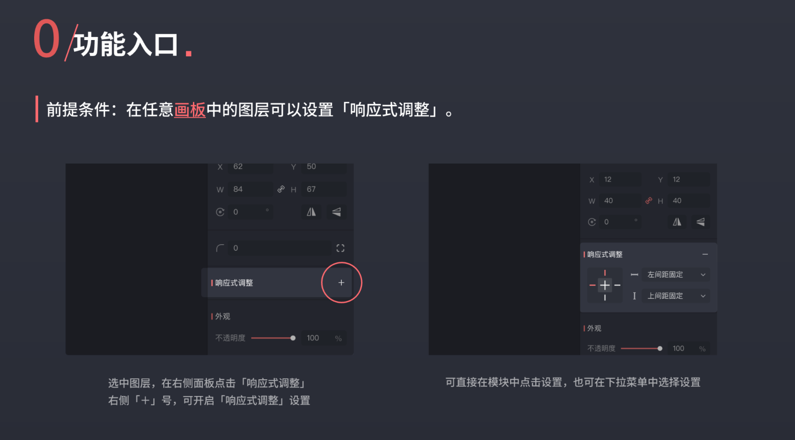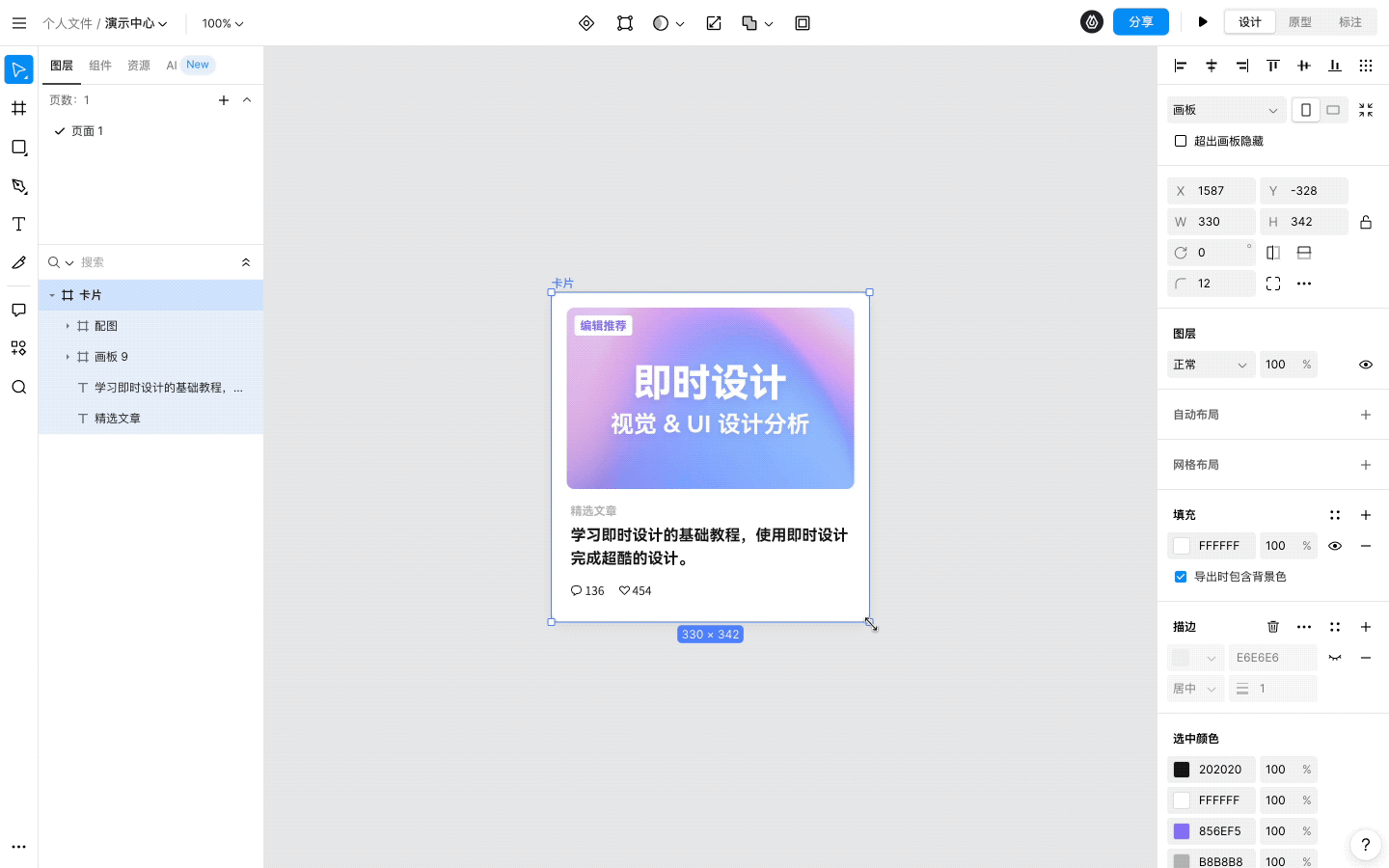 打开即时设计,你可以直接导入设计稿,或在平台中重新搭建网页结构。选中画板中的图层,点击 「添加 → 响应式调整」,即可为图层启用响应式属性。如果使用的是「引用组件」,系统会自动添加响应式调整,非常省心。