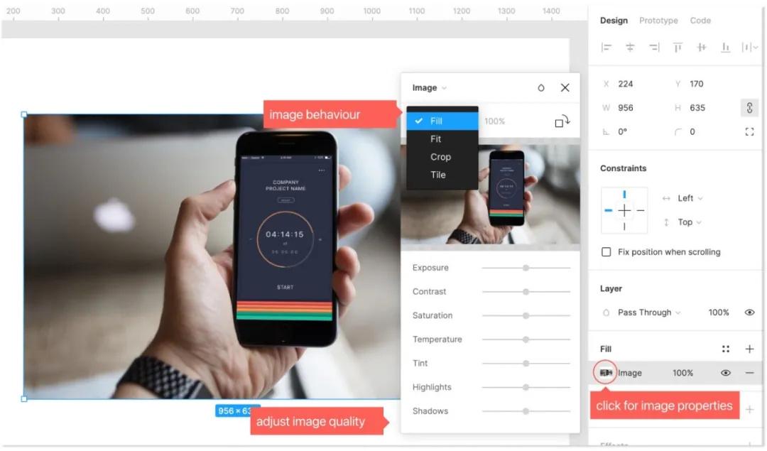 在Figma中,图像始终放置在形状蒙版内部。更改图像的形状,打开图像属性,点击右侧属性窗口上的“填充”。